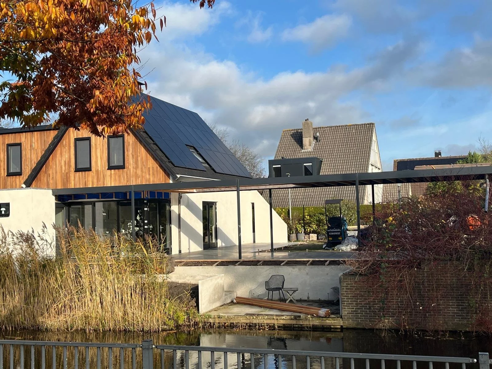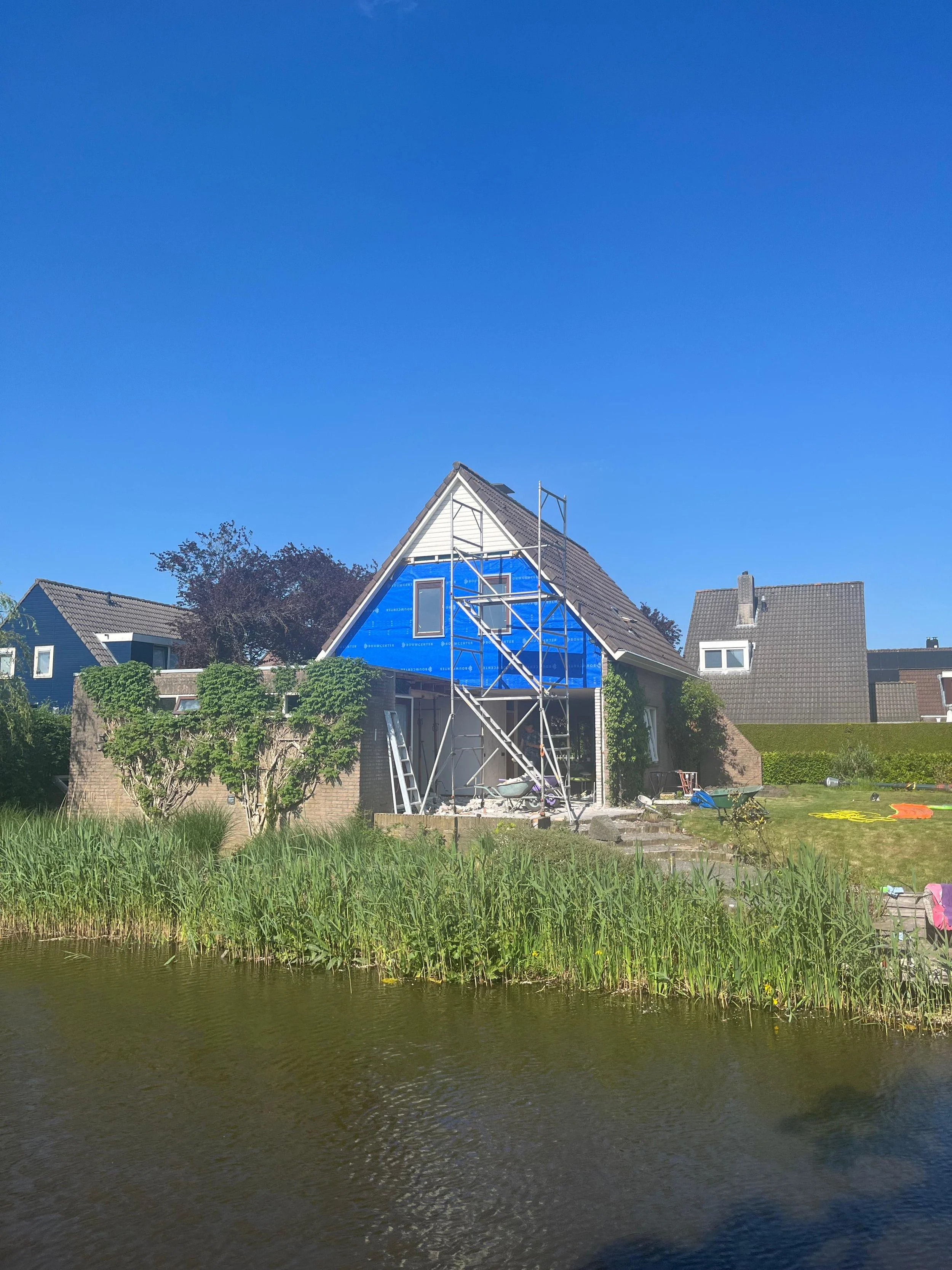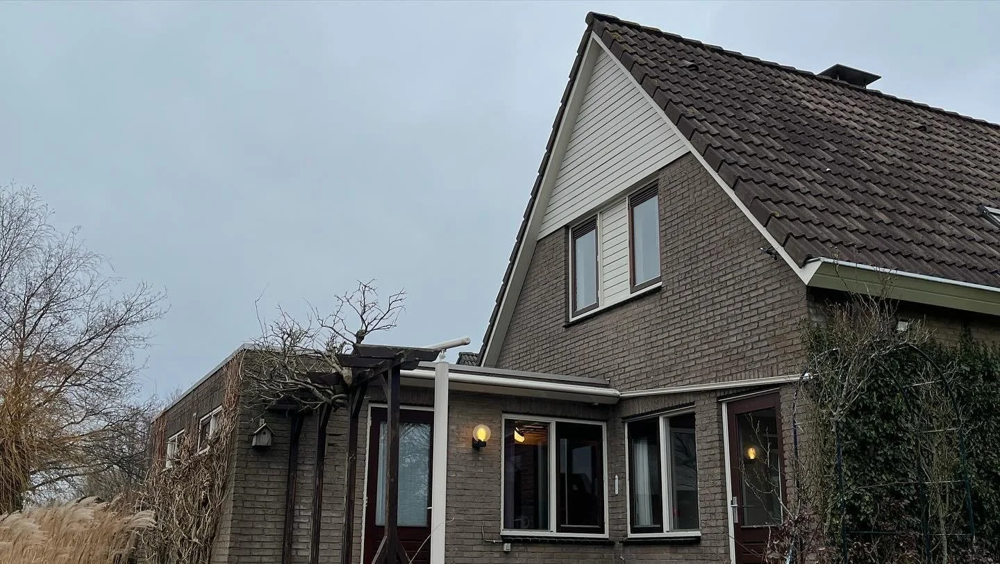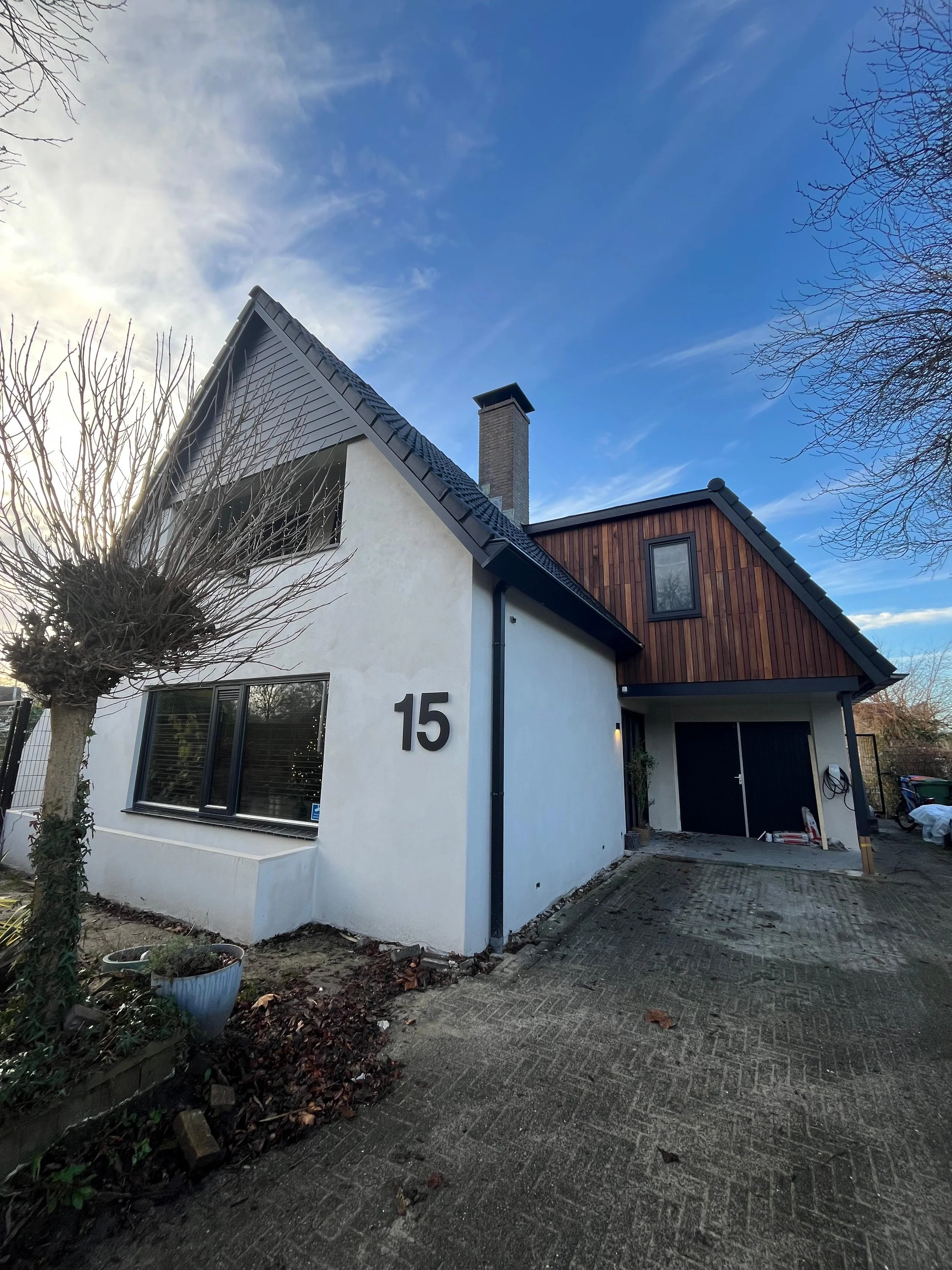 Het eindresultaat van de woning wordt weergegeven in de afbeeldingen. De opdrachtgevers hebben gekozen voor buitenmuren met een frisse witte verflaag en een antracietkleurige plint, wat de woning een moderne uitstraling geeft. Daarnaast zijn de twee uitbouwen zichtbaar, waarin een nieuwe keuken en een extra slaapkamer zijn gerealiseerd.